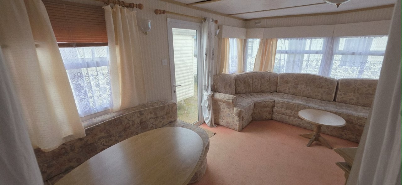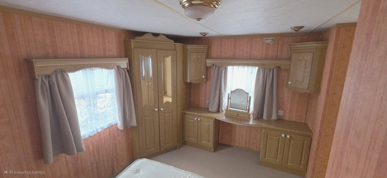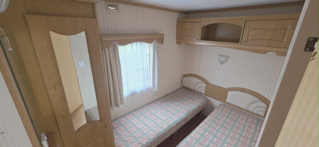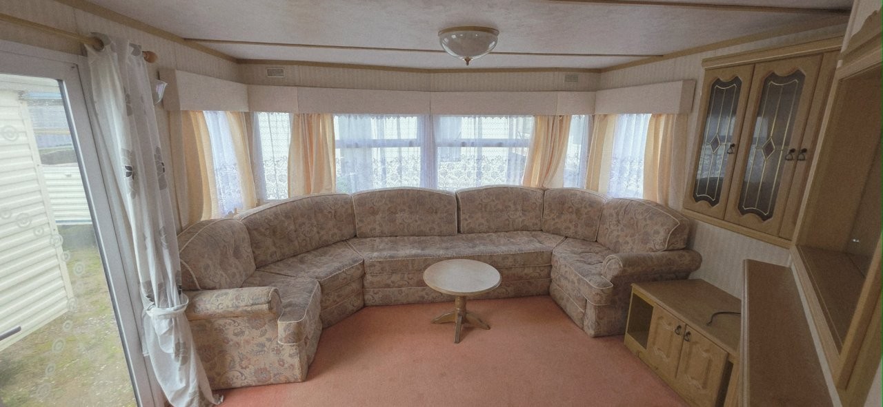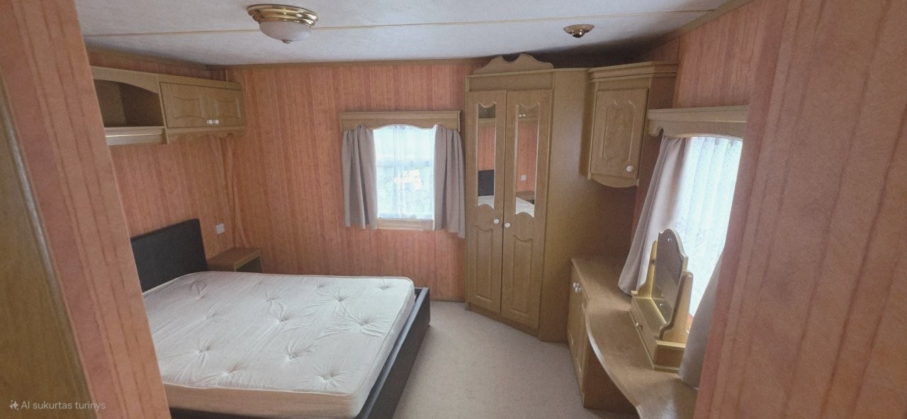 Całoroczny domek mobilny, dwupokojowy, na kołach w bardzo dobrym stanie. W salonie kanapa z rozkładanym łóżkiem i kominkiem gazowym, stół kuchenny. Jedna 2-osobowa sypialnia z łózkami pojedynczymi, druga sypialnia z podwójnym łóżkiem. Łazienka i ubikacje.