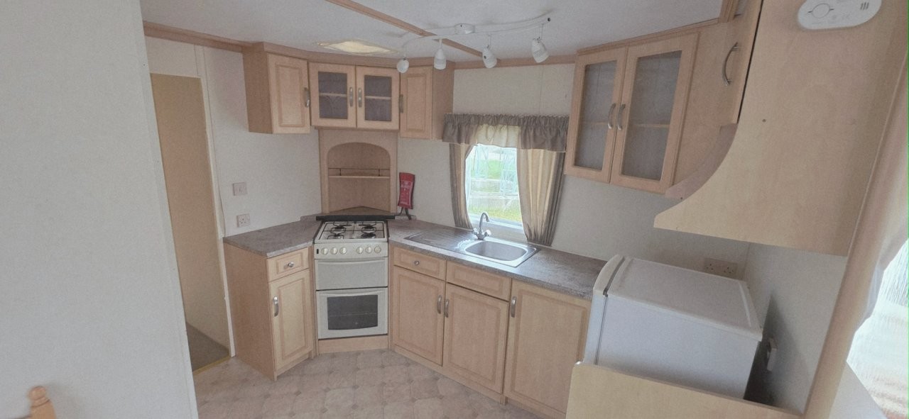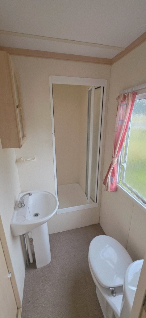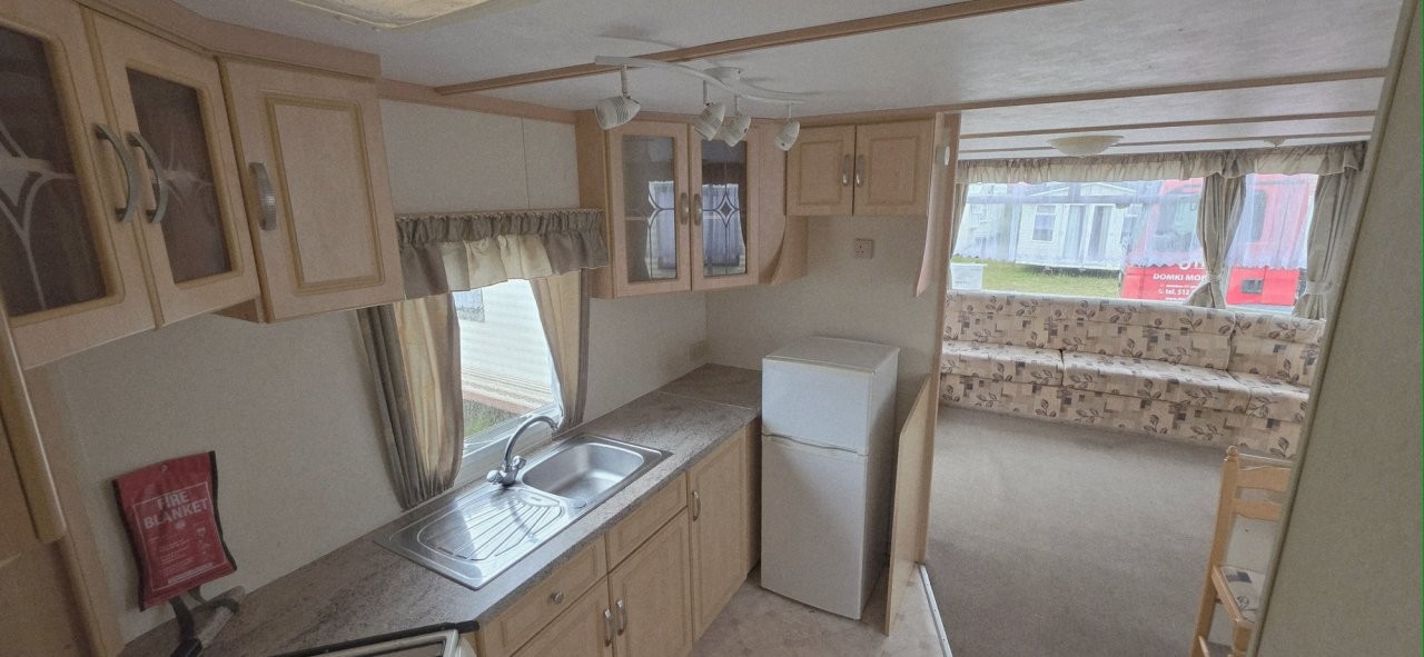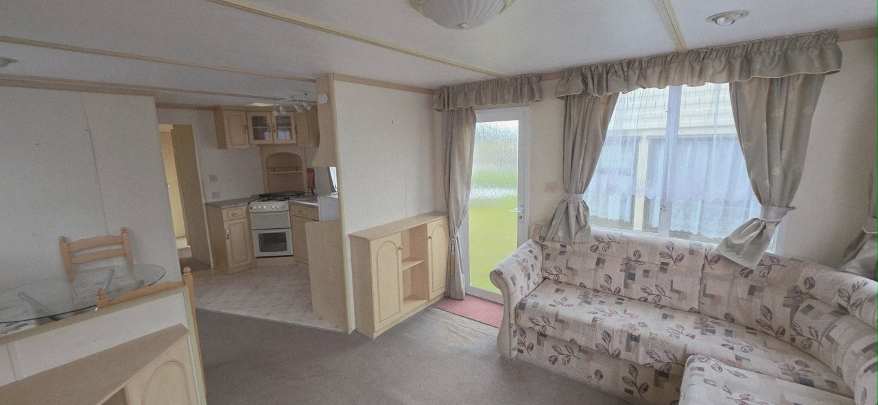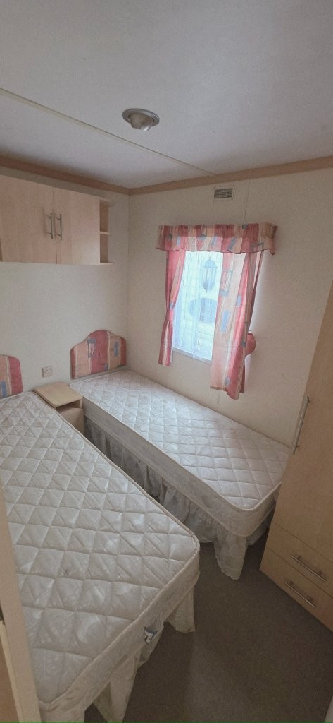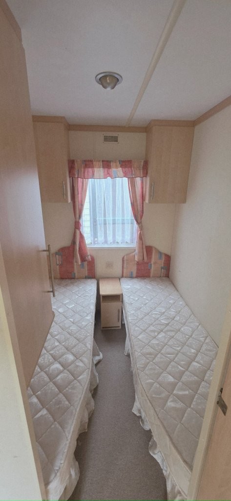 Trzypokojowy domek na kołach w bardzo dobrym stanie. W salonie kanapa z rozkładanym łóżkiem i kominkiem gazowym, stół kuchenny. Dwie 2-osobowe sypialni z łózkami pojedynczymi, jedna sypialnia z podwójnym łóżkiem. Łazienka i dwie ubikacje.